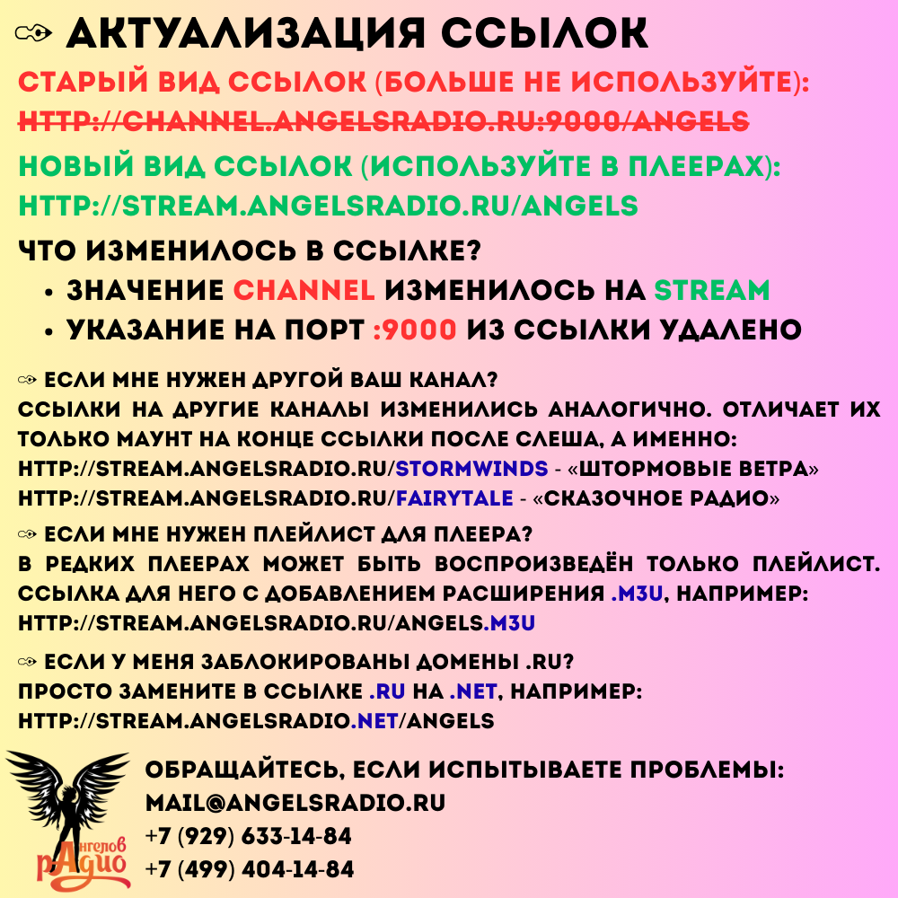 В целях усиления стабильности приёма потоков трансляции радиостанции в локальных плеерах на Ваших устройствах, просим Вас постепенно заменить любые старые ссылки на поток вещания новыми, которые выглядят так: