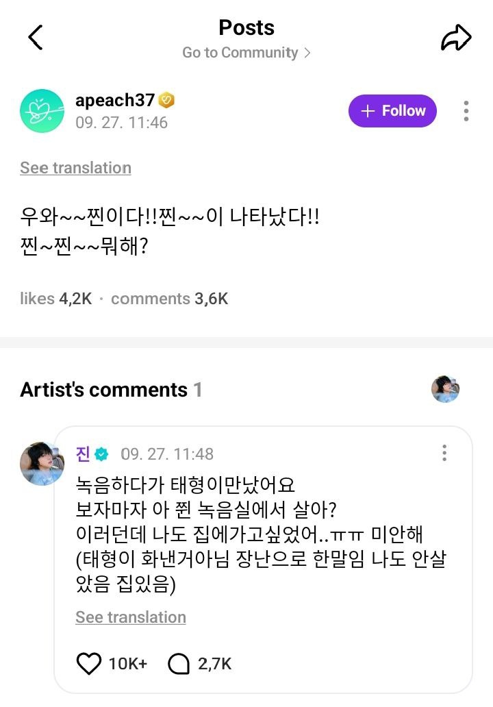🐾 Джин на Weverse: Арми: Вау, реально!!? Джин тут! Что делаешь? Джин: Записывался и встретил Тэхёна. Как только он увидел меня, спросил: "О, Джин, ты что, живёшь в студии звукозаписи?" Мне аж домой захотелось..ㅠㅠ Извините. (Тэхён не злился, он сказал в шутку, я там не живу, у меня дом есть) #JIN @kumihobts