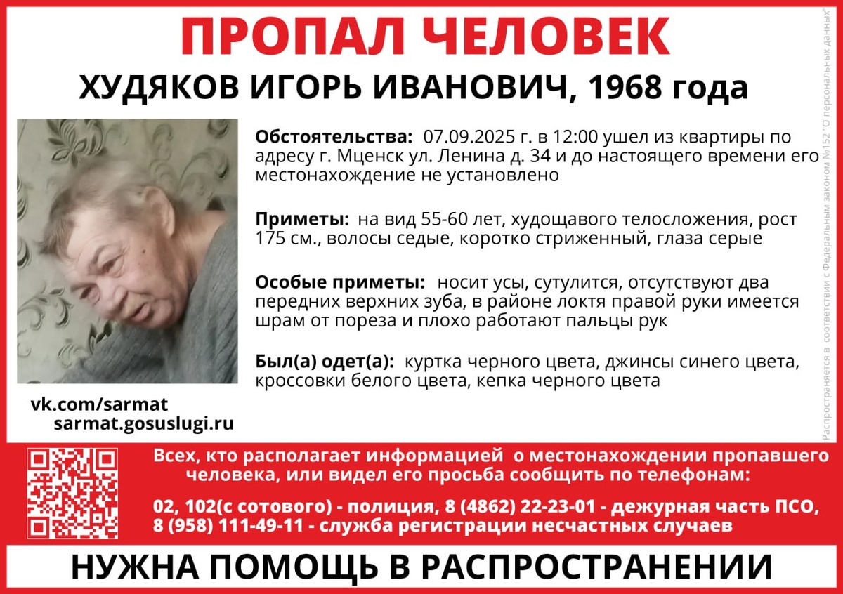 МО МВД России "Мценский" устанавливается местонахождение Худякова Игоря Ивановича 11.02.1968 года рождения, проживающего в г. Мценск , который 07.09.2025 г. в 12:00 ушел из квартиры по адресу г. Мценск ул. Ленина д. 34 и до настоящего времени его местонахождение не установлено.