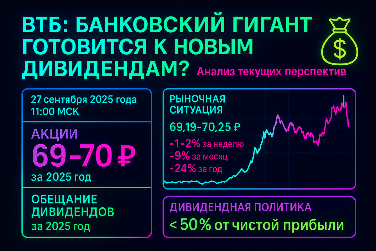 На 27 сентября 2025 года в 11:00 МСК, руководство ВТБ подтвердило планы по выплате "больших" дивидендов за 2025 год. После рекордных выплат за 2024 год в размере 25,58 рубля на акцию (275,75 миллиарда рублей общей суммы), банк планирует продолжить щедрую дивидендную политику.