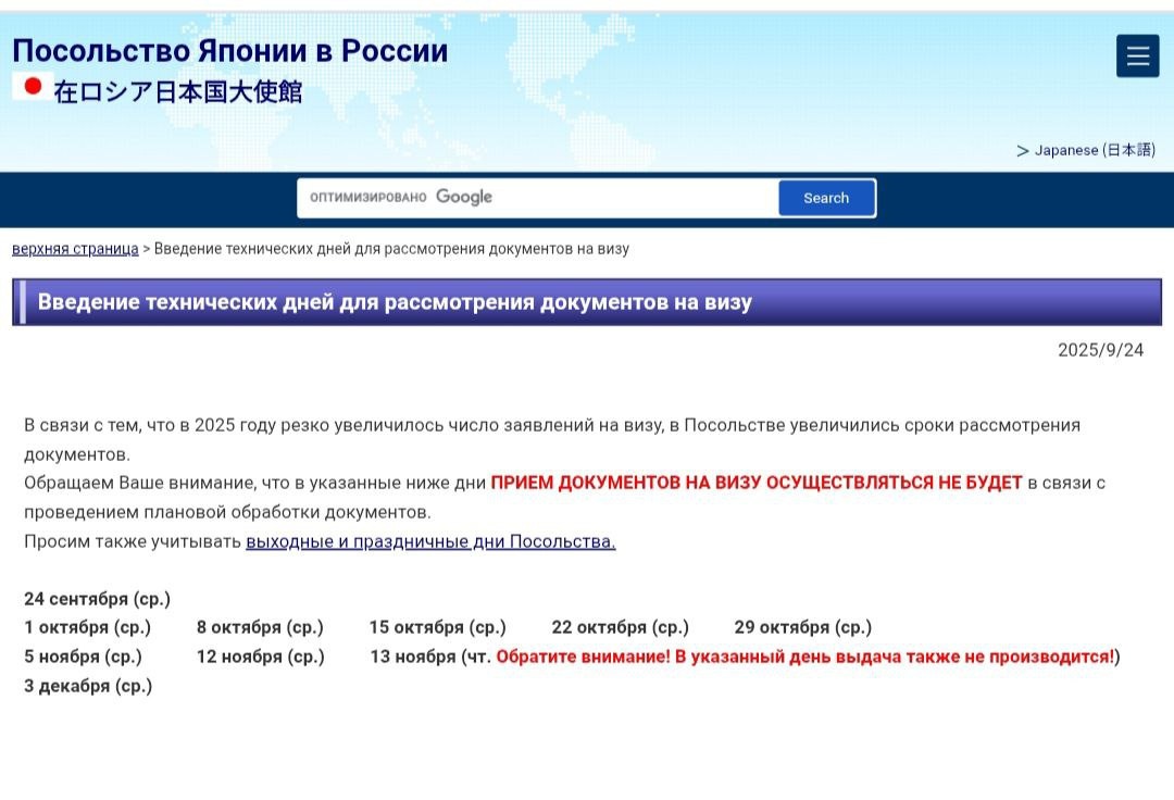У нас День туризма. А у Посольства Японии в Москве неприемные дни. Дипломаты продолжают устраивать их, чтобы разобрать документы заявителей на визу. Ранее ограничения вводили на короткий период, но поток желающих увидеть красные кленовые цветочки не дает возможности принимать туристов 5 дней в неделю – иначе сроки оформления увеличатся. Теперь в Москве не будут ждать посетителей все среды в октябре и первой половине ноября, плюс даже один четверг. Спокойнее должно стать к декабрю. К тому моменту все летящие на период момидзи будут уже с визами. Подробнее написали на ТурДоме. @tourdom