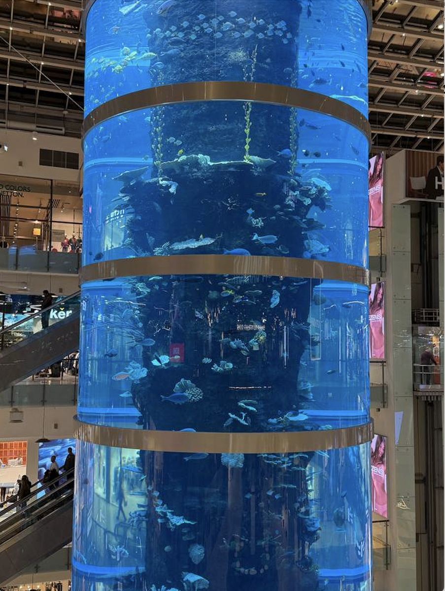 Крупнейший торговый центр "АВИАПАРК" известен с 2014 года. Находится он на территории бывшего Ходынского аэродрома в Хорошевском районе города Москвы и расположен вблизи выхода из метро на станции "ЦСКА". Здание состоит из 6 этажей и впечатляет своей огромной площадью, которая составляет около 400 кв. метров. В нем расположились разные торговые точки известных брендов, места общественного питания и развлекательные объекты. В целом здесь организовали свою работу около 500 магазинов с разным направлением товаров. Особой достопримечательностью "АВИАПАРКА" стал гигантский аквариум в центре зала, который внесен в книгу рекордов Гинесса. Аквариум выполнен в стильном дизайне в виде цилиндра, высотой около 23 метров и объемом заполненным водой до 400 куб.м . Материалом для изготовления аквариума послужило прочное акриловое стекло, которого потребовалось более 50 тонн. Дополнительно объект укреплен специальными круговыми стяжками для защиты от непредвиденных природных катаклизмов типа зем