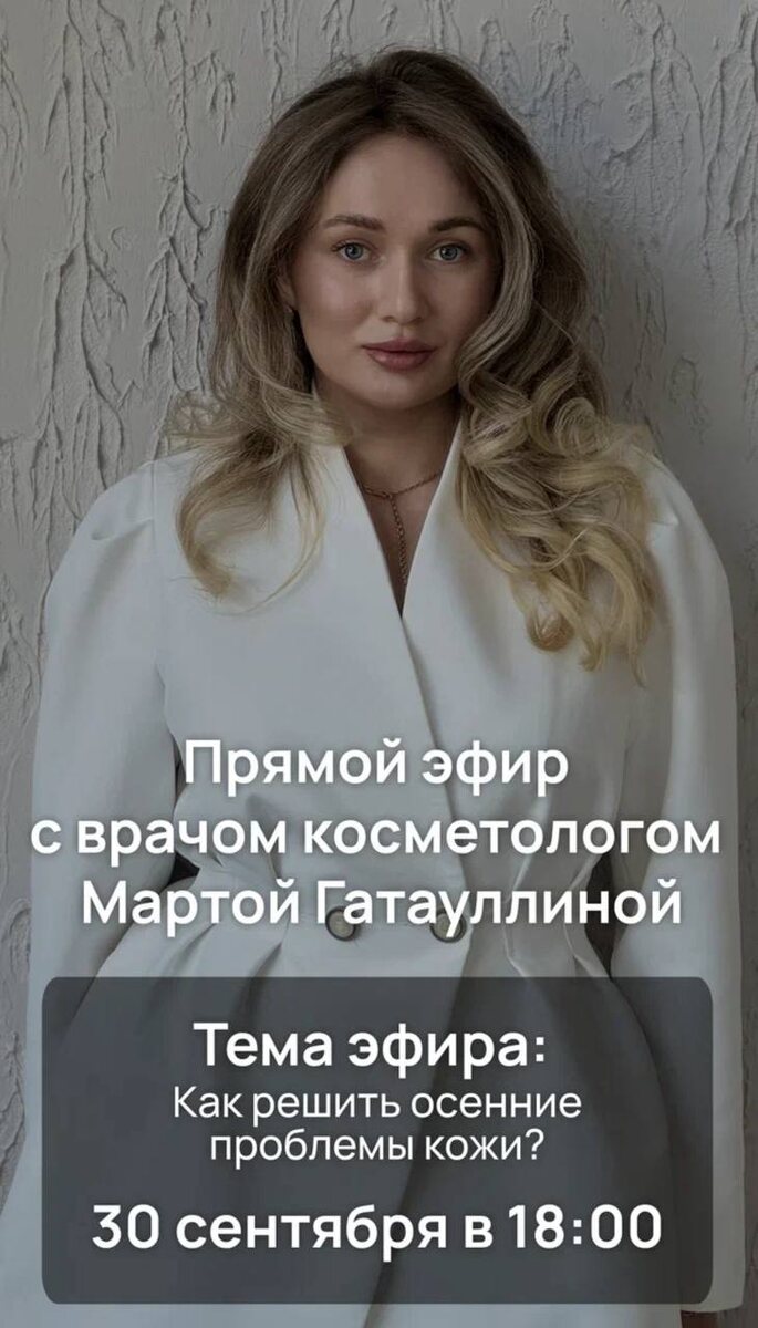 Напоминаем, 30 сентября в 18:00 мы проведем прямой эфир с врачом-косметологом — Мартой Гатауллиной ❤️