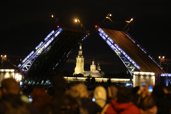 В ночь на 27 сентября на Дворцовом мосту состоялось специальное световое шоу с проекциями знаковых объектов Санкт-Петербурга. Мероприятие приурочили к Всемирному дню туризма.