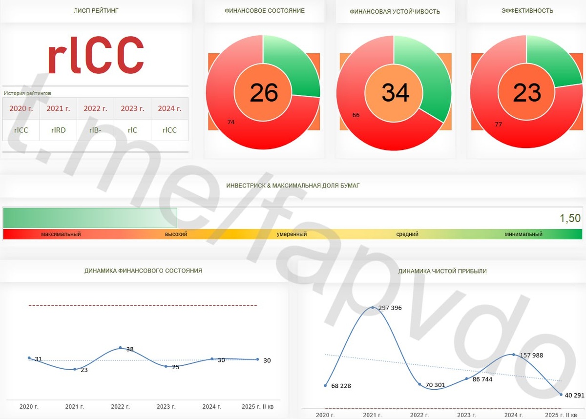 Каждый заём Феррума приближает его к банкротству ℹ️ООО «Феррум» предлагает полный цикл услуг по обработке и поставке металлопроката для судостроения и судоремонта. Компания сотрудничает с крупнейшими металлургическими заводами России, такими как ММК, НЛМК, Уралсталь, ЮГМК. Феррум является единственным дилером по продаже полособульбового профиля производства Омутнинского метзавода. ИНН — 5263039350 Так контора говорит сама о себе, а что на самом деле… Финансовое состояние ⭐️На конец II кв. 2025 года, ООО «Феррум» — рискованное, значительно закредитованное, малоэффективное предприятие. Выручка в отчётном периоде составила 2 822.7 млн, чистая прибыль 40.3 млн рублей. ⭐️На 1 рубль собственного капитала приходится 3.96 рубля заёмных денег. Заёмный капитал обеспечен собственными резервами на 25%. Общая задолженность компании состоит из 145.7 млн рублей долгосрочных обязательств и 1 935.4 млн текущих. ⭐️Кредитоспособность предприятия умеренная. ЛИСП рейтинг: rlCC ⭐️ООО «Феррум» — компани