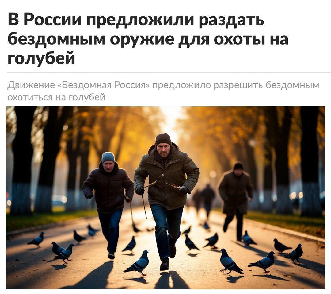 Привет, друзья! Сегодня мы поговорим об инициативе, которая может кардинально изменить жизнь бездомных людей в России. Общественники предложили вооружить бездомных пневматическим оружием, чтобы они могли охотиться на голубей. Это решение, по их мнению, поможет очистить города от пернатых разносчиков инфекций, а сами бездомные получат бесплатный источник еды. Кроме того, авторы инициативы предложили обязать отели заселять бездомных в пустующие номера, а россиян, владеющих несколькими квартирами, пускать бродяг на ночлег. Эта инициатива вызывает множество вопросов и споров. С одной стороны, она может помочь решить проблему бездомных людей и уменьшить количество голубей в городах. С другой стороны, есть опасения, что это может привести к новым проблемам и конфликтам. Какие могут быть последствия этой инициативы? С одной стороны, бездомные люди получат возможность улучшить своё положение, а города станут чище. С другой стороны, есть риск, что это приведёт к увеличению конфликтов между людь