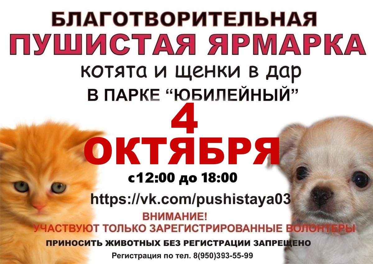 4 октября с 12 до 18 часов пройдёт благотворительное мероприятие — 🐶🐱 «Пушистая ярмарка».В этот день празднуется Всемирный день защиты животных. И мы очень надеемся, что случится чудо и многие наши подопечные разъедутся по домам. ✨ В уютном парке «Юбилейный» гостей ждут очаровательные животные, ищущие новых хозяев ❤️📸 Приглашаем всех желающих сделать яркие фотографии и обрести верного друга! Можно будет выбрать себе котёнка, щенка, кошку или собаку. ❗ Все полученные средства направятся на поддержку животных. Принимаем любую помощь для животных. Эта акция будет посвящена памяти нашего волонтёра и смм-менеджера Светлане Тарбажеевой, которая очень много помогала бездомным животным Бурятии, но к сожалению так рано покинула нас... Будем рады видеть вас на нашем празднике осени и добрых встреч! 🌷💚 #пушистаяярмарка_03