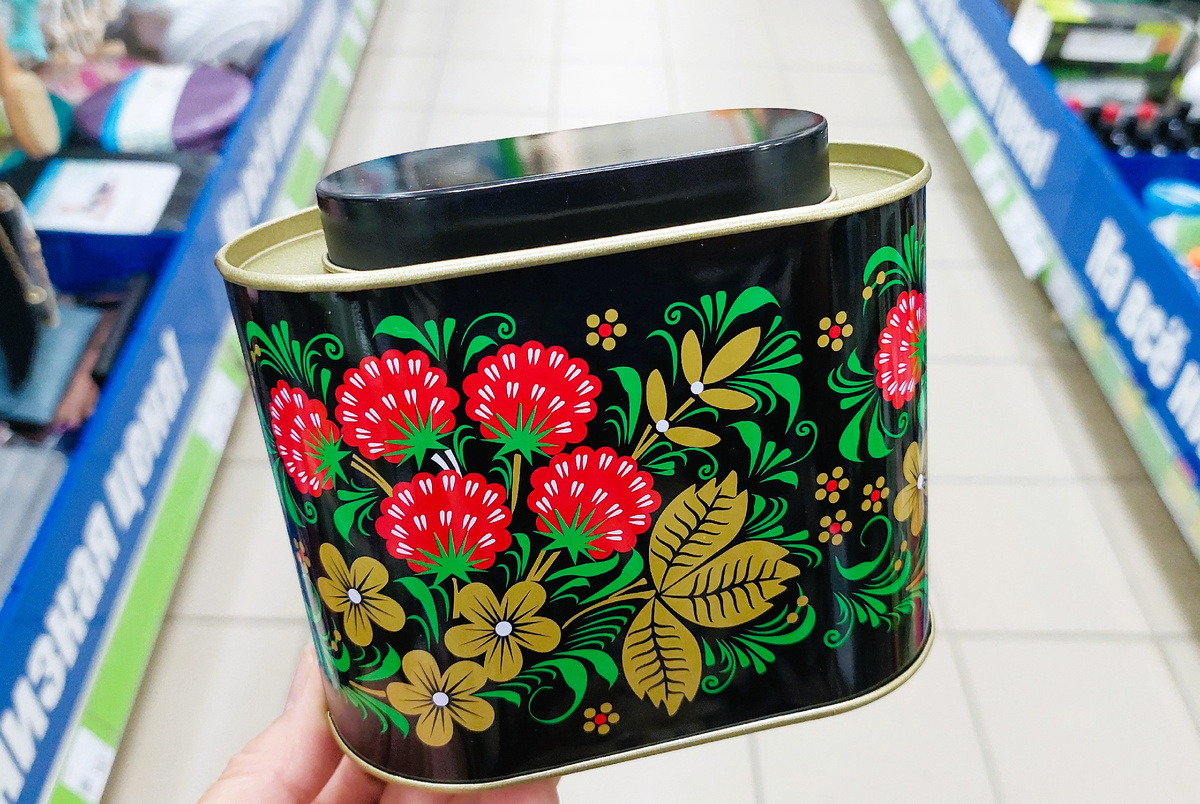 Банка с яркими узорами Хохломы, в традиционной стилистике. Поможет хранить крупы, печенье или конфеты. Размер: 14×7,4×12 см. Состав: жесть.