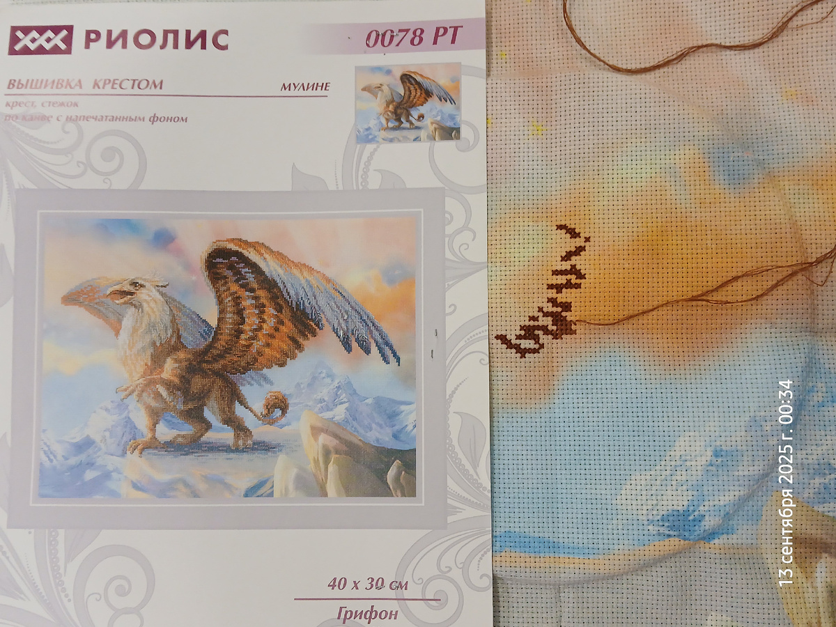 13 сентября я подготовила новый процесс, который будет вышиваться в моей небольшой поездке. Риолис-Грифон. Работа выполняется на канве с нанесенным рисунком, размер 40*30, но это наверное размер основы, сам дизайн конечно же чуть меньше, 19 цветов ниток+бленды. Нитки с родных органайзеров я порезала и перемотала на пластиковый органайзер для удобства работы.