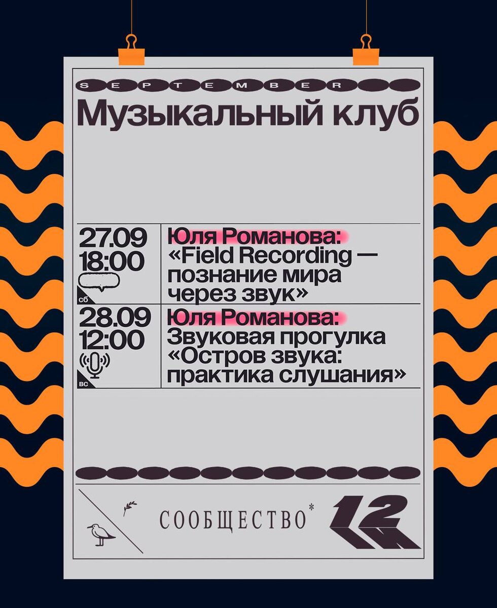 Сегодня и завтра насыщенная программа! Всех ждём 😉 🗓 27.09/18:00 2️⃣ Лекторий Тема: «Field Recording — познание мира через звук» — Юля Романова (создательница и ведущая проекта о доступном филд-рекординге «В соседней комнате всегда тихо»). “Field Recording (полевые записи) — это практика записи звуков окружающей среды вне студийных условий. Она включает в себя фиксацию природных, городских или индустриальных звуков, а также других акустических ландшафтов с целью их документирования, художественного использования или изучения. Звуковая практика концентрирует внимание, собирает мысли воедино, замедляет ход времени. В этом процессе некуда спешить, но при этом важно успеть заметить детали. Вместе с Юлей Романовой поговорим о филд-рекординге, его основных направлениях и о всем, что связано с познанием мира через звук. Юля расскажет о своем проекте, созданном для любителей и единомышленников, которые познают окружающий мир самыми разными способами, о любительских звуковых исследованиях,