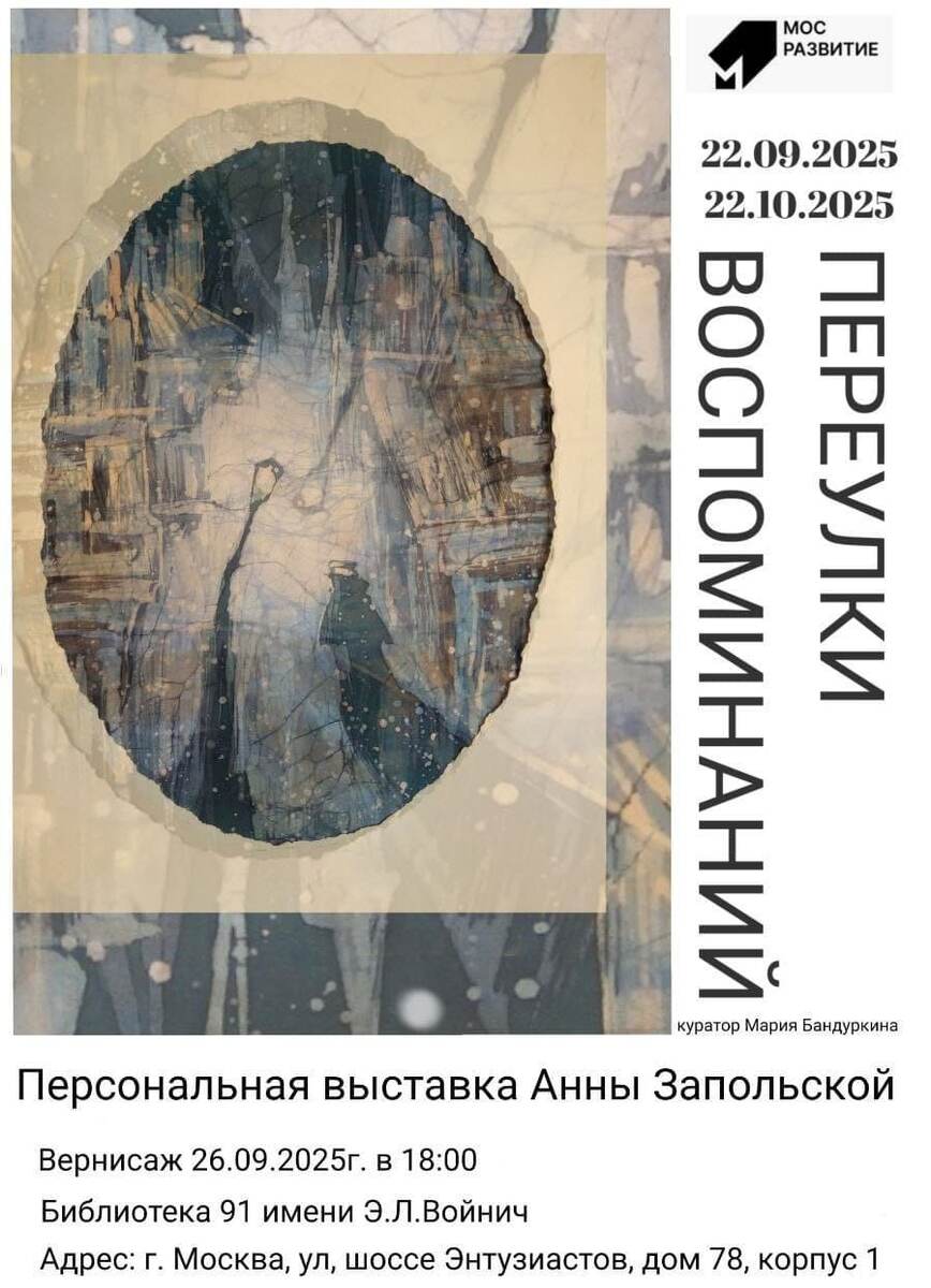 «Город — как шёлк: соткан из тысяч нитей-историй. Холодный камень стен становится теплым, когда пропущен через руки художника» Воспоминания всегда с нами, хорошие или не очень, они - часть нас, нашей жизни. Порой они скрываются за повседневными событиями, скучные или радостные, иногда прячутся где-то глубоко в памяти, проявляясь вдруг из знакомых, еле уловимых образов, очертаний, звуков, ассоциаций, возвращающих нас у чему-то давно забытому. Узкие улочки города, его аллеи, переулки, закоулки и проулки, переплетаясь между собой, создают сложный и многогранный узор жизни. Горячий батик, с его текучими линиями, многослойностью, наложением слоев, сложной гаммой цвета и уникальной фактурой, передает эмоциональную глубину, хрупкость и изменчивость воспоминаний. Выставку можно посетить с 22.09.2025-19.10.2025 Адрес: Библиотека 91 им. Э.Л. Войнич. г.Москва, ул, шоссе Энтузиастов, дом 78, корп 1. Куратор Мария Бандуркина