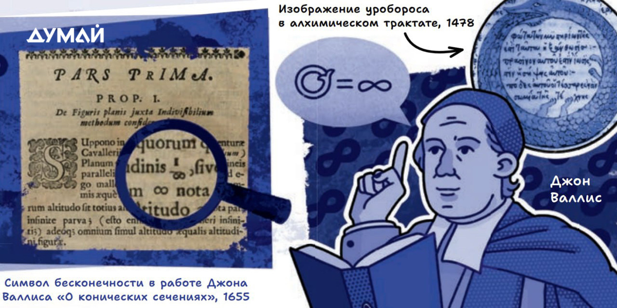 Долгое время считалось, что математика должна оперировать конкретными, конечными величинами, поэтому такого абстрактного понятия, как «бесконечность», в ней просто не может быть. Античные математики побаивались бесконечности и старались избегать вычислений, которые к ней приводили. По легенде, знаменитый Пифагор пришёл в такой ужас, когда его ученик попытался извлечь корень из двух, что столкнул в воду своевольного юношу — слишком уж иррациональный получался ответ! 🧬 Привычный нам знак бесконечности ∞ ввёл в 1655 году английский математик ДЖон Валлис в трактате «О конических сечениях». Удивительно, но выбор этого символа он никак не объяснил! Вам ∞ может напомнить об Уроборосе — змее, кусающем себя за хвост. Этот символ бесконечности и циклической природы жизни встречается во многих древних культурах, но обычно он обозначается кольцом. Уроборос «восьмёркой» тоже встречается, но, вероятно, появился уже после Валлиса. 👀 Символ Валлиса стал широко использоваться математиками в начале X