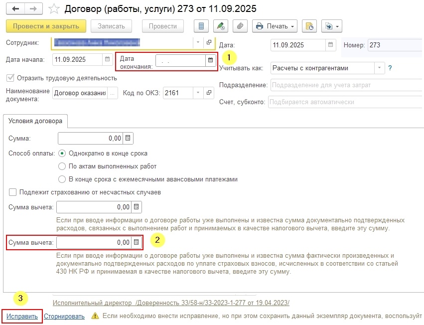 - Добавлена возможность создавать «Исправления» документов. Аналогичная возможность появилась в документах «Акты приемки выполненных работ» и «Договоры авторского заказа».