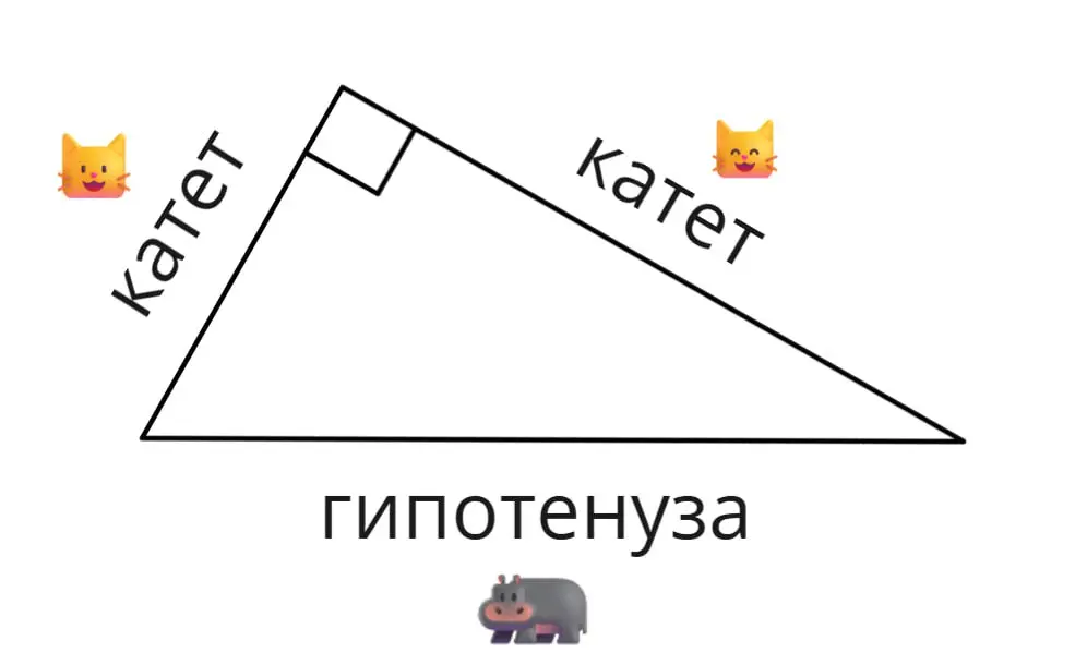 Впечатляет, что мы используем в школе огромное количество непонятных слов. Стоит их прояснить. Начнём с катетов. Катет — "καθέτος", означает «опущенный перпендикулярно, отвес». Сейчас мы называем катетом сторону прямоугольного треугольника, прилежащую к прямому углу, но так было не всегда. В Средние века словом cathet называли высоту прямоугольного треугольника, в то время как его основанием была гипотенуза. В XVII в. слово начинает употребляться в современном смысле и широко распространяется в XVIII в. И в русском языке слово жило и менялось: у Магницкого (автора задачника времён Петра I) — катетус (1703); в 1803 г. зафиксировано - кафет (транслитерировали из греческого языка); Буняковский (русский математик, академик Петербургской академии наук) писал - катем (1839); Владимир Даль употреблял в женском роде — катета. В 1896 году уже фиксируем собственно -- катет. Интересно, что в английском языке чаще используется не катет, а «leg» (нога). В немецком есть термины Ankathete и Gegenkath