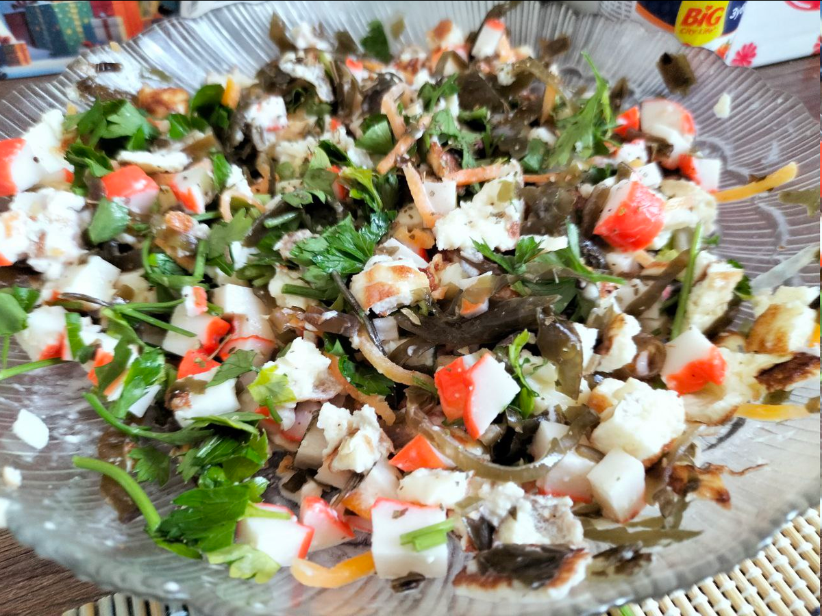 Этот яркий салатик делается за минуты и очень выручает во всех случаях. Угостить гостей или приготовить себе легкий и питательный, а главное вкусный ужин, то этот рецепт именно то, что нужно. Делается из доступных продуктов и без майонеза. Вместо майонеза в данном случае рекомендую использовать пасту, с ней вкус лучше, а какую смотрите на фото далее в рецепте. Ингредиенты: Из яиц надо сделать блинчик-омлет. Смешиваем их с ложкой молока и щепоткой соли. Выливаем на горячую сковороду и обжариваем омлет с двух сторон. Выложив со сковородки, нарезаем яичный блинчик тонкими полосками или небольшими кусочками. Водоросли немного измельчаем, чтобы они не были длинными волокнами. Нарезаем мелко крабовые палочки. Выкладываем все в салатник, чуть подсаливаем. А вот и фишка салата. Чтобы он был мягче и придать ему интересный вкус, я добавляю столовую ложку вот такой намазки - Или вот такой - Вкусов такого продукта много, так что можете выбирать на свое усмотрение. Заправив салат, хорошо перемешива