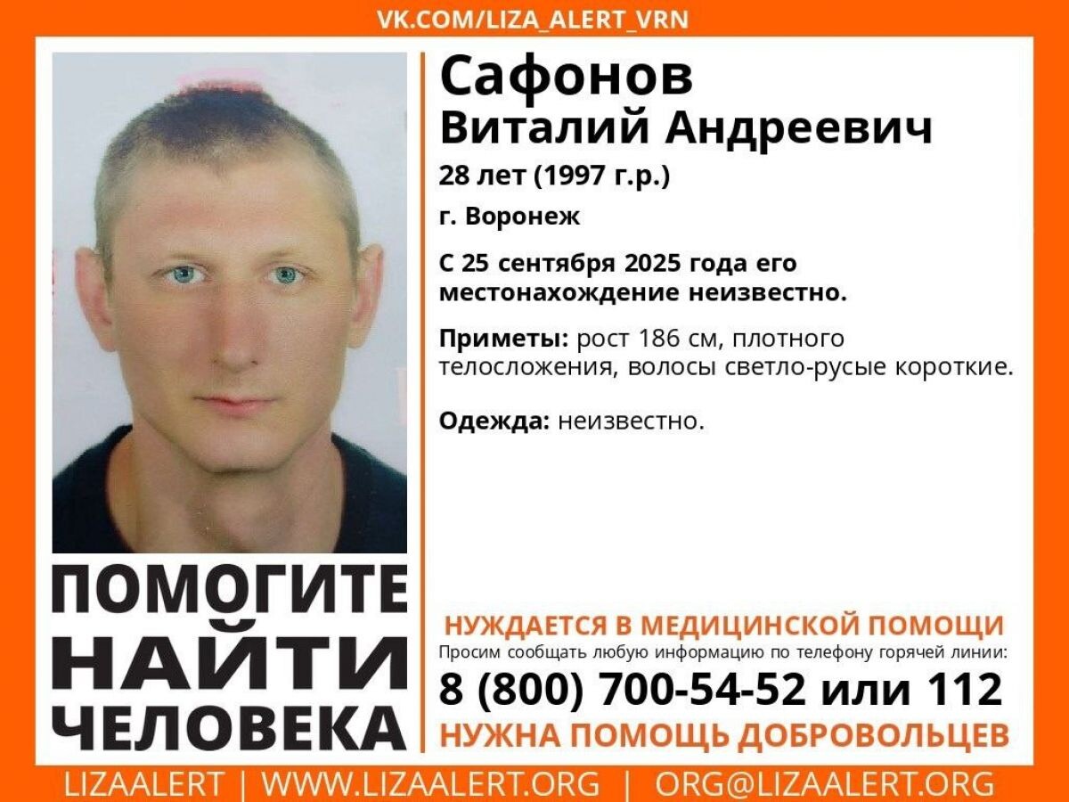 В Воронеже пропал без вести 28-летний Виталий Сафонов. Молодой человек ушёл из дома в четверг, 25 сентября, и не вернулся. Об этом рассказали волонтёры поискового отряда "ЛизаАлерт". Рост Виталия составляет 186 сантиметров. У мужчины плотное телосложение и короткие светло-русые волосы. Во что был одет пропавший – неизвестно. Волонтёры также уточнили, что Виталий нуждается в помощи медиков. Если вы обладаете информацией о возможном местонахождении Виталия Сафонова, просьба сообщить об этом в полицию по номеру 112 или позвонить волонтёрам по телефону, указанному на ориентировке. А в четверг, 25 сентября, в Воронеже нашли пропавшую 15-летнюю Владиславу Иванову. Где находилась девушка в течение трех дней, неизвестно.