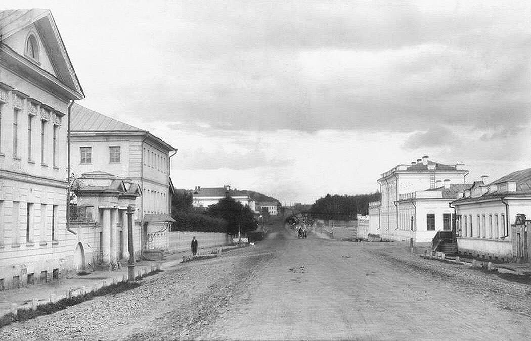 Александровский проспект. Вид на Царский мост 🔄Фото с другой стороны 📸Снимок датируется 1880—1889 гг. ❗️Название Александровский проспект было дано в честь пребывания императора Александра I в Екатеринбурге в сентябре 1824 года; вскоре после этого через Исеть по этой улице возвели новый деревянный переход, получивший название Царский. В 1889—1890 гг. деревянную переправу заменили каменным сооружением по проекту архитектора С. С. Козлова. Современное название — улица Декабристов — присвоено в 1919 году в память о проезде через город ссыльных декабристов, направлявшихся в Сибирь. Слева на фотографии видны усадебные постройки купцов Казанцевых, возведённые в 1820—1824 гг. по чертежам Михаила Павловича Малахова: в ансамбль входили двух- и трехэтажные дома (в трёхэтажном располагался театр), два флигеля, многочисленные служебные постройки, баня, оранжерея и сад. Жилые корпуса разделялись воротами, через которые осуществлялся въезд во двор, а в двухэтажном доме имелась старообрядческая
