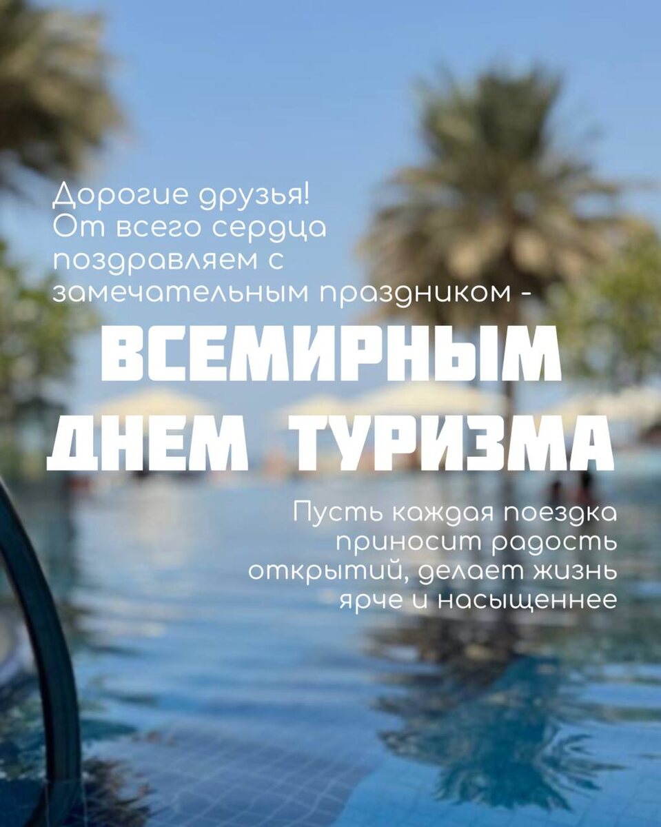 Дорогие друзья!✈️ От всего сердца поздравляем с замечательным праздником — Всемирным Днём Туризма! Ваше стремление к новым открытиям, жажда приключений и любовь к путешествиям делают жизнь ярче и насыщеннее. Желаем вам бескрайних горизонтов, интересных маршрутов и незабываемых впечатлений. Пусть каждая поездка приносит радость открытий, а новые места покоряются легко и непринуждённо. Спасибо за ваш выбор и доверие!