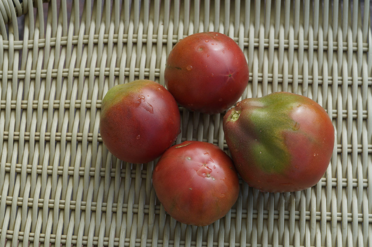Пока не забыла, по свежим следам хочу рассказать о самых удачных сортах уходящего сезона. В будущем году буду сажать их побольше. Вообще я каждый год выбираю помидоры по отзывам, и каждый раз далеко не все получаются вкусными. Поэтому у меня большой вопрос кто и зачем их хвалит. Хотя, возможно им просто не нравятся мои условия. Но расскажу о тех, кому понравилось у меня и кто понравился мне. Вообще многие грушевидные томаты вкусные. В пошлом году у меня был какой-то итальянский сорт, тоже неплох. Но этот выше всех похвал. Цвет у него бордовый. Вместе с ним я выращивала другую грушу "Японский трюфель", про которые тоже было много восторженных отзывов. Ну не знааааю...Наверное, кто его хвалил не пробовал "Винный кувшин". "Трюфель" гораздо более пресный и водянистый. Отличаются они цветом. Слева "Японский трюфель" оранжевый, справа "Винный кувшин" бардовый: Такой он в разрезе: Вкус очень богатый и сбалансированный, особенно важно, что он вкусен даже сейчас, осенью! Томат индетерминантны