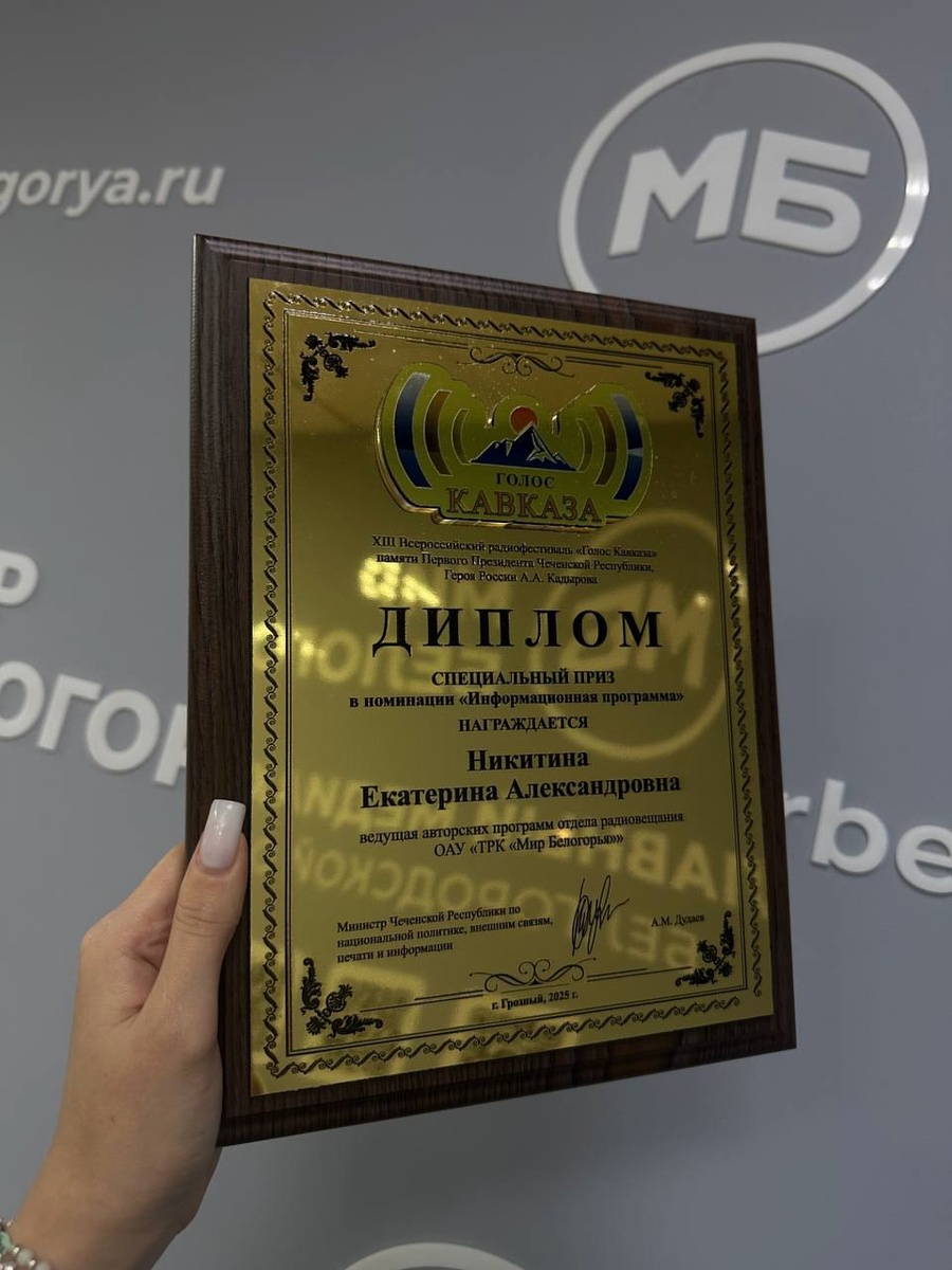 Ведущая авторских программ «Радио «Мир Белогорья» во второй раз стала призёром конкурса «Голос Кавказа» Екатерина Никитина была отмечена специальным призом в номинации «Информационная программа». XIII Всероссийский радиофестиваль прошёл в столице Чечни. В 2025 году на него поступило около 500 заявок от 72 региональных радиостанций, работы оценивались в трёх номинациях: «Утреннее шоу», «Информационная программа» и «Тематическая программа». Мы на связи в MAX Подписаться на нас|Предложить новость