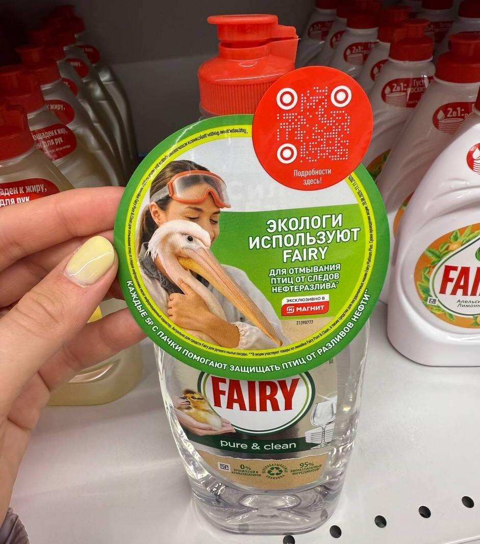 На полках найден такой товар с надписью: «Экологи используют Fairy для отмывания птиц от следов нефтеразлива». Цитата из правил акции с сайта: «Акция направлена на привлечение внимания потребителей к торговой сети магазинов «Магнит» и укрепление позитивного имиджа торговой марки “Fairy” на российском рынке.» Что думаете?