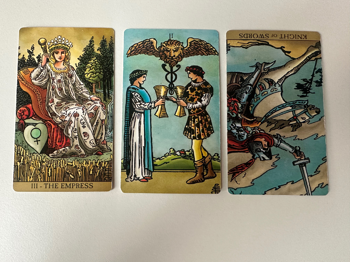 Про чтение комбинации карт в раскладе Друзья, всех приветствую, решила написать небольшую заметку про чтение раскладов. С практикой я понимаю, что очень полезно овладеть навыком чтения карт в комбинациях, то есть делать вывод сразу по нескольким картам, учитывая энергию карт, куда смотрят изображения на картах итд. Я иногда читаю по одной карте, например, в позиционных раскладах и сразу все ясно, даже дополнительные не нужны. Но в некоторых случаях я люблю разложить три карты на вопрос, и часто их совместное прочтение все разъясняет. Хочу с вами поделиться одним примером. Ситуация - у партнеров случился конфликт, который начал партнер (мужчина), и девушка спросила, как будет развиваться эта ситуация в ближайшую неделю. Получился вот такой расклад: императрица, 2 кубков, рыцарь мечей перевернутый. На первый план для меня сразу вышла карта 2 кубков, она как будто стационарная, две другие при этом ее дополняют, значит я понимаю, что она ведущая (результат - примирение в нашем случае, обс