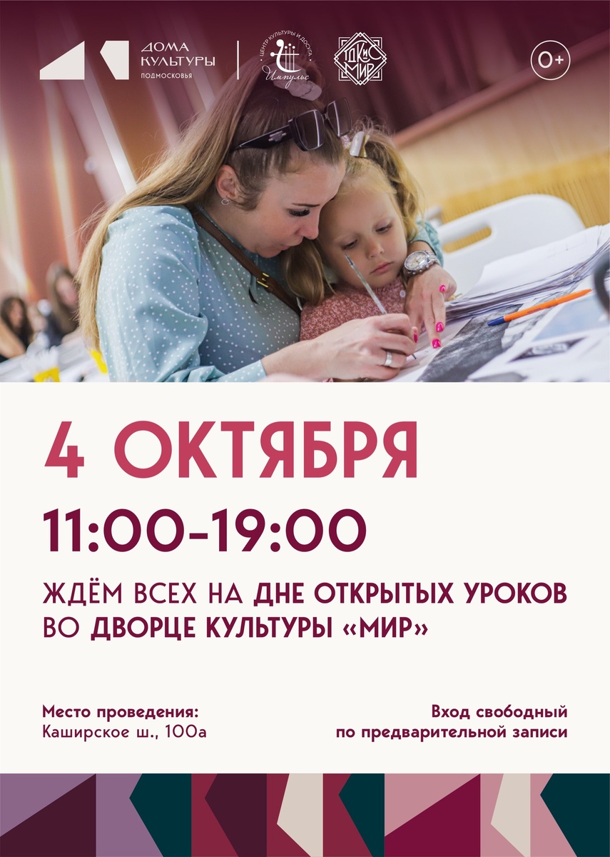 ✨ Дорогие друзья! 🌟 Дворец культуры «Мир» открывает для вас не только свои парадные двери, но и двери каждого кабинета! 🎉 Приглашаем вас на День открытых уроков, чтобы заглянуть и посмотреть, как занимаются наши коллективы, а также принять участие в увлекательных мастер-классах! 🎨🎶 📅 Ждем вас 4 октября 2025 года по адресу: Каширское шоссе 100А. Наш мир открыт каждому! 💖 🚫 Возраст: 0+ 📆 04.10.2025🕒11:00 🏢 Дворец культуры и спорта «Мир» 📍 г. Домодедово, Каширское шоссе, д.100А 💰 Вход свободный❗️ ✅ Мероприятия Домодедово https://dzen.ru/id/66f10385cc4c5a16f7b5fb02 http://vk.com/domodedovo_events http://dzen.ru/domodedovo_events