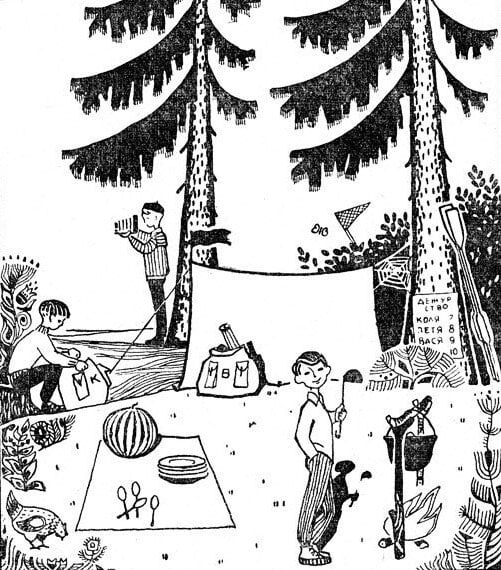 ❗️ Ответ на вопрос выходного дня 1. Четыре друга: Коля, Петя, Вася, Шура (4 ложки и тарелки, 4 дежурства в расписании). 2. Приехали (приплыли) они сюда несколько дней назад, так как паук уже сплел паутину между палаткой и деревом. 3. Они приплыли на лодке, так как к дереву прислонены весла. 4. Ближайшее селение совсем близко от лагеря, так как в лагере разгуливает курица. 5. Ветер дует с юга судя по тени от дежурного (солнце высоко и днем оно на юге), кроме того у деревьев ветки короткие с северной стороны и костер явно наклонен на север. 6. Время дня - утро, судя по тени. 7. Шура ушел ловить бабочек - сачок мелькает в кустах. 8. Вчера был дежурным Коля, а сегодня - Петя (рюкзаки подписаны их инициалами). Коля сидит около своего, а Васин рюкзак со штативом для фотоаппарата стоит у палатки. Шура - с сачком в кустах, значит Петя у костра с поварешкой (все по расписанию). 9. Сегодня - 8 августа, так как дежурит Петя (число в расписании). Месяц - август, так как созрели арбузы.