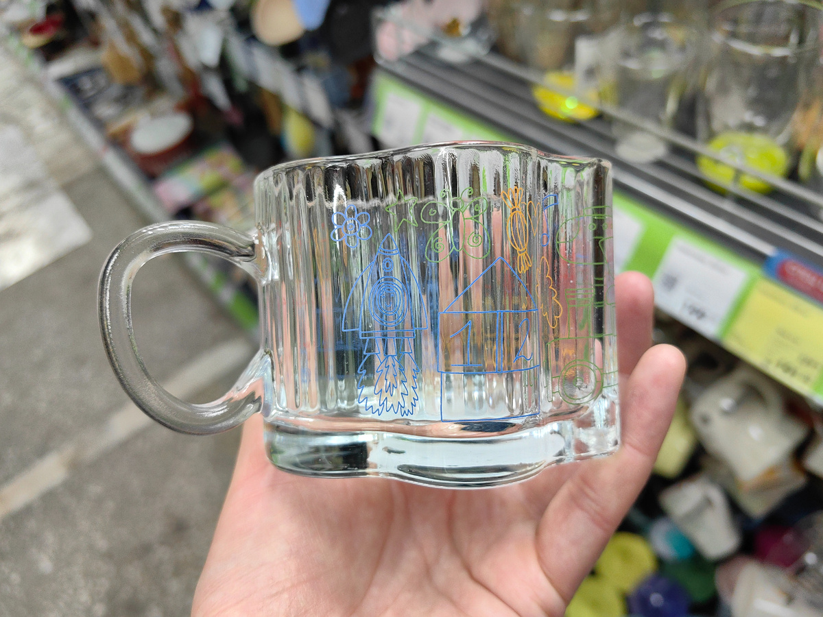 удачная поставка, таких новинок еще не было в Фикс Прайс, особенно много всего для кухни. Взять эти же низкие кружки. Стекло, форма необычная, и принт приятный такой, словно детский рисунок перенесли. Это все потому, что кружки из коллекции детской посуды. Можно и не только для детей, просто себе для позитивного настроения. А, если посмотреть на кружку сверху? А сверху как цветок. Новинка не одна, такой формы еще кружечка, с забавными мультяшными героями. Будет еще с котиками и с единорогами. С таким же цветочком высокие стаканы, форма такая. Единственное, нет на поверхности рельефа, просто гладкое стекло. Стакан высокий, без принта. Рядом много разных стаканов, и по цвету, по форме отличаются. В разное время привозили. Выставили турки, были прошлой осенью. И, знаете, это две разные коллекции, но очень похожи. Получается, кто покупал Янтарную посуду, можно дополнить из Жар-птицы, тон один. Отличие может быть в толщине стекла. Соусницы привезли, каждая запаяна в пленку, чтобы к