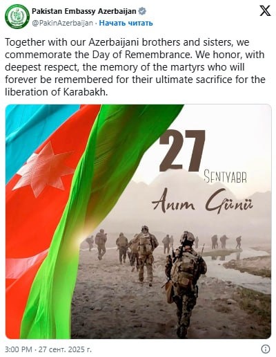🇵🇰🇦🇿 Посольство Пакистана в Азербайджане почтило память шехидов 44-дневной Отечественной войны. Дипмиссия на своей официальной странице в социальной сети X поделилась публикацией в связи с 27 Сентября - Днем памяти. "Мы вместе с нашими азербайджанскими братьями и сёстрами отмечаем День памяти. С глубоким уважением чтим память шехидов, беспрецедентной самоотверженностью во имя освобождения Карабаха навсегда останутся в нашей памяти", - говорится в публикации. #ruoxuaz #посольствоПакистанавАзербайджане #Отечественнаявойна ✈️ Новости Азербайджана 🔗 Написать нам