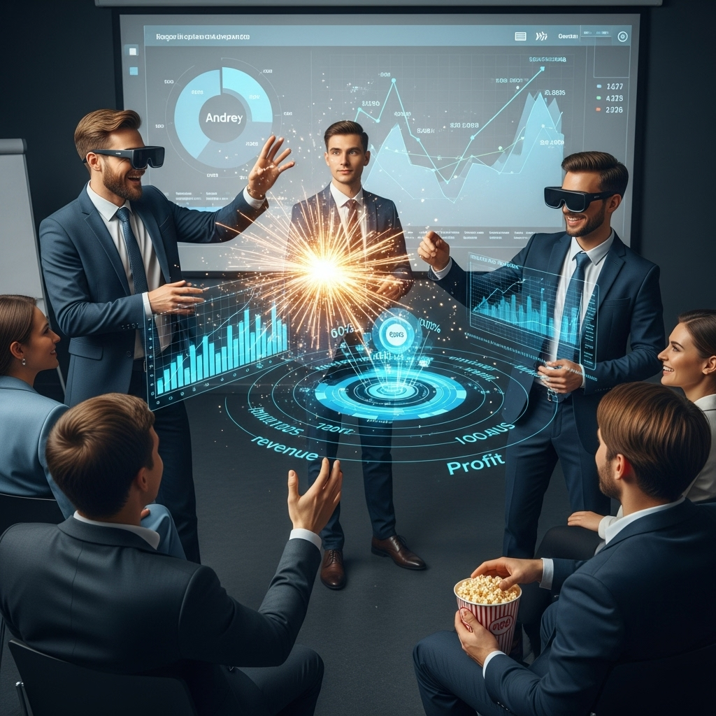 Но тут на сцену вышел Дмитрий из маркетинга. Он не мог позволить себя затмить. Его презентация началась с того, что экран превратился в пульт управления звездолета. "Коллеги, давайте посмотрим на наши показатели под другим углом", — сказал он, раздавая очки дополненной реальности. Голографические графики поплыли по комнате, а один чуть не задел нос спящего бухгалтера.