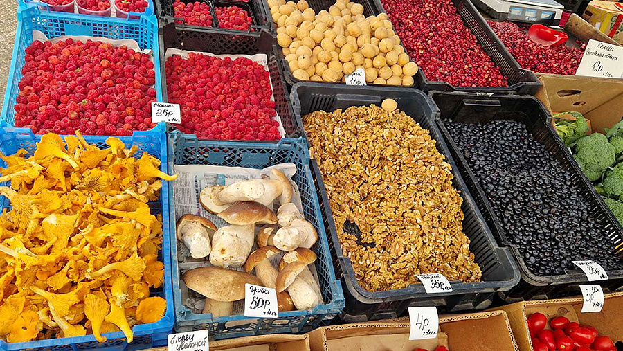 Настоящая антоновка, «бульба по рублю», гречишный мед, отборные боровики — ассортимент сельскохозяйственной ярмарки в Заводском районе оценила корреспондент агентства «Минск-Новости». Традиционно на торговых рядах много корнеплодов. И закупаются потребители, как правило, впрок: берут внушительными сетками. Картофель стоит от 30 копеек за килограмм. Причем цена одного сорта варьируется в зависимости от размера клубней. Тот же «некси» есть и за 70 копеек, и за 1,40 рубля. «Вектор» рекламируют как самый вкусный. Владельцы прилавка с вывеской «Бульба по 1 рублю» предлагают еще и доставить товар до подъезда. При условии, что закупаетесь основательно — от двух сеток. Свеклу отвешивают от 1,20 до 2,60 рубля за килограмм, и по верхней границе идут отборные корнеплоды «паола». Морковь стоит от 1,40 до 2 рублей, капуста — от 1,20 рубля белокочанная, от 6 рублей — цветная, от 8 рублей — брокколи. Сладкие перцы можно найти от 3,50 рубля за кило, острый чили значительно дороже — по 13 рублей. Стоим