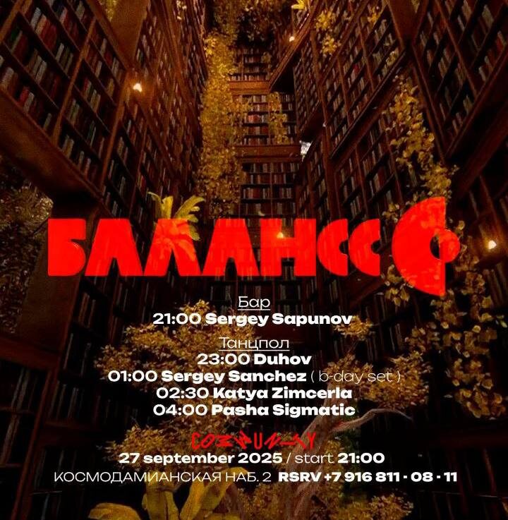 27 СЕНТЯБРЯ 2025 / БАЛАНСС В COMMUNITY Вечеринка Балансс собирает друзей в пространстве культурного центра Community. В эту ночь отмечаем День рождения маэстро Сергея Санчеса, а винтажный звук от компании Dynacord раскроет всю палитру хаус музыки от резидентов и гостей проекта: 🎫 Билеты 📆 27 сентября, в 21:00 📍 Community Moscow, Космодамианская наб., 2