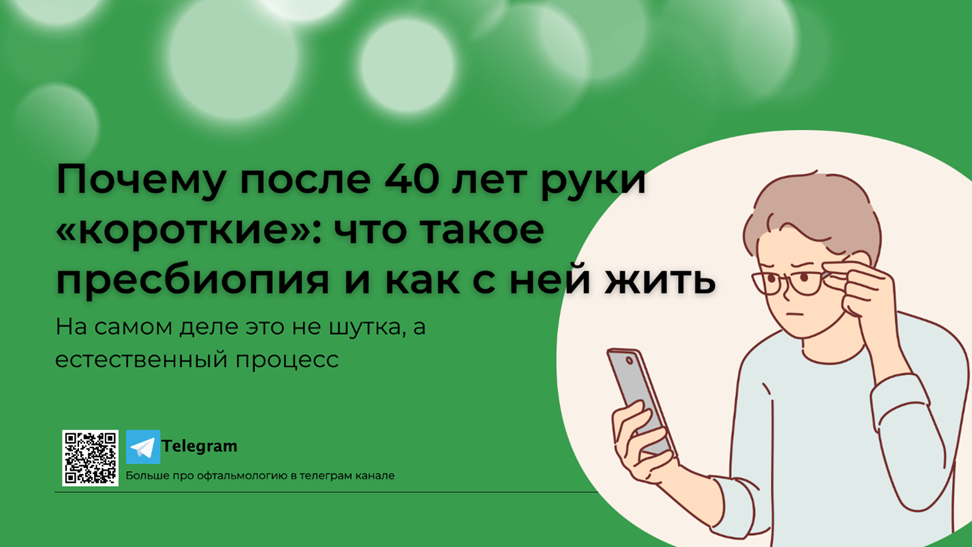 Многие шутят: «После сорока у людей руки становятся короткими — книгу приходится отодвигать всё дальше, чтобы разглядеть буквы». На самом деле это не шутка, а естественный процесс, который называется пресбиопия или возрастная дальнозоркость. Наш глаз работает как камера: хрусталик меняет форму и фокусирует изображение на сетчатке. В молодости он эластичный, и мы легко переводим взгляд с экрана телефона на дорогу и обратно. После 40 лет хрусталик постепенно теряет гибкость, мышцы вокруг него уже не могут «настраивать резкость» так, как раньше. В итоге читать мелкий шрифт, шить или работать с телефоном становится всё труднее. · приходится отодвигать книгу или телефон подальше; · вечером глаза устают быстрее; · мелкие буквы начинают расплываться; · иногда появляется головная боль при длительном чтении. Важно понимать: пресбиопия — не болезнь, а естественное возрастное изменение. Остановить процесс невозможно, но есть способы компенсировать его. 1. Очки для чтения