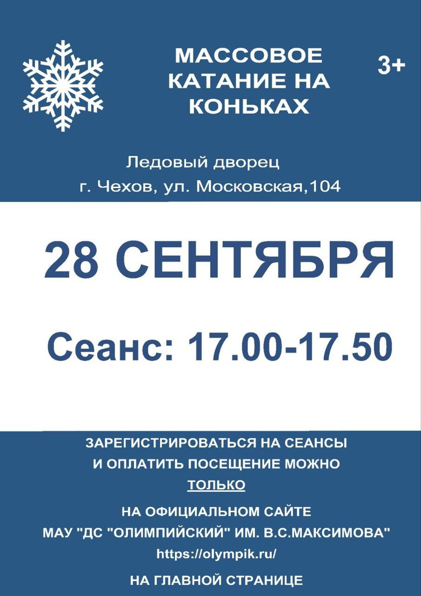 ✨ МАССОВОЕ КАТАНИЕ на льду в Ледовом дворце 👉Сеанс: 17:00-17:50 🎵 К вашим услугам качественный лед, хорошая музыка, прокат и заточка коньков. ℹ️ Размеры коньков: с 27 по 46. 💵 Стоимость проката: детские 200 руб., взрослые 300 руб. 🚫 Возраст: 3+ 📆 20.09.2025 🕛 18:45 🏢 Ледовый дворец спорта «Витязь» 📍 г. Чехов, ул. Московская, д.104 💰 Цена от: 140 до 280 ₽ 🔗 Купить билет: https://clck.ru/3NsBk2 🚫 Возраст: 3+ 📆 28.09.2025 🕛 17:00 🏢 Ледовый дворец спорта «Витязь» 📍 г. Чехов, ул. Московская, д.104 ⭐Поддержать канал голосом #webЧехов ✅ Мероприятия Чехов https://dzen.ru/id/66cc4b48e9ef144699238a51 http://vk.com/chekhov_events http://dzen.ru/chekhov_events