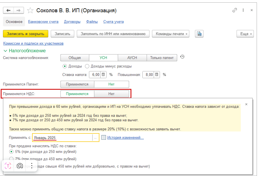 Выбираем свою судьбу (ставку): Тут нужно подумать. 5%, 7% или общая 20%? Выбор зависит от ваших оборотов. Подсказка в программе вам в помощь. Главное — не заблудитесь в трех соснах. И обязательно укажите месяц, с которого начали применять НДС.