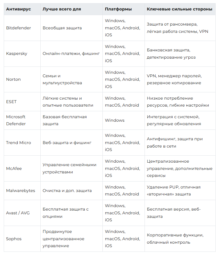 Ниже — мой отобранный список. Я учитывал реальные тесты независимых лабораторий, функциональность для ПК и мобильных устройств, а также пользовательский опыт. Каждый пункт содержит сильные стороны и для кого продукт наиболее подходит.