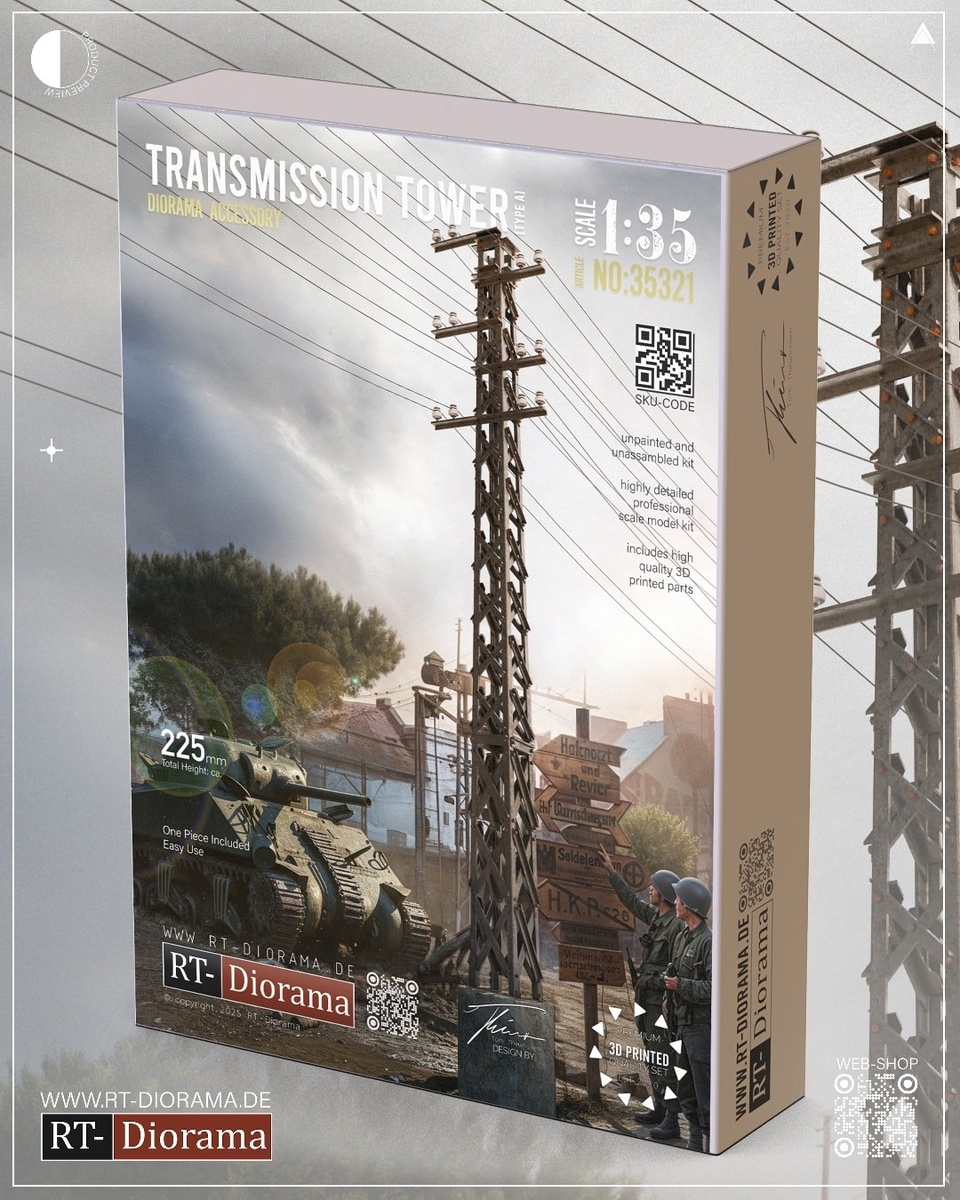 Немецкая RT-Diorama выпустила на 3D-принтере модели металлических столбов линии электропередач в масштабе 1/35: Transmission Tower (каталожный номер 35321)