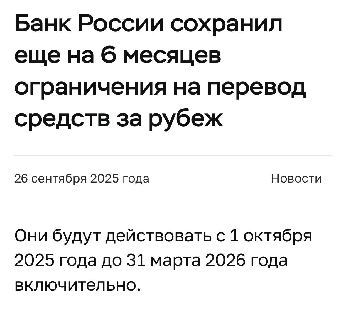 🔒 ЦБ продлил ограничения на переводы за рубеж ещё на полгода до 31 марта 2026