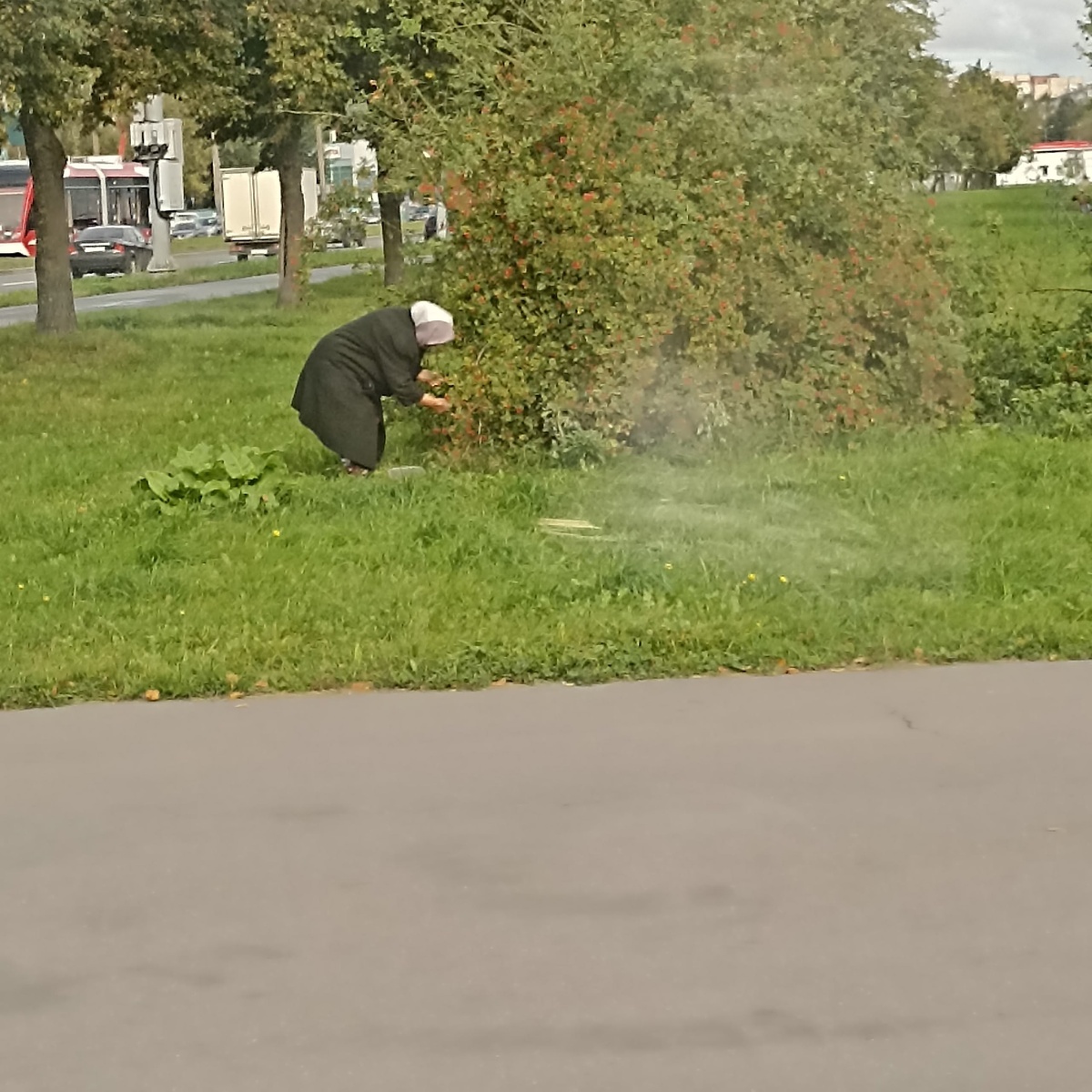 Собирает шиповник на перекрёстке Тельмана/ Дальневосточный, а потом продаёт его у метро ( "со своей дачи