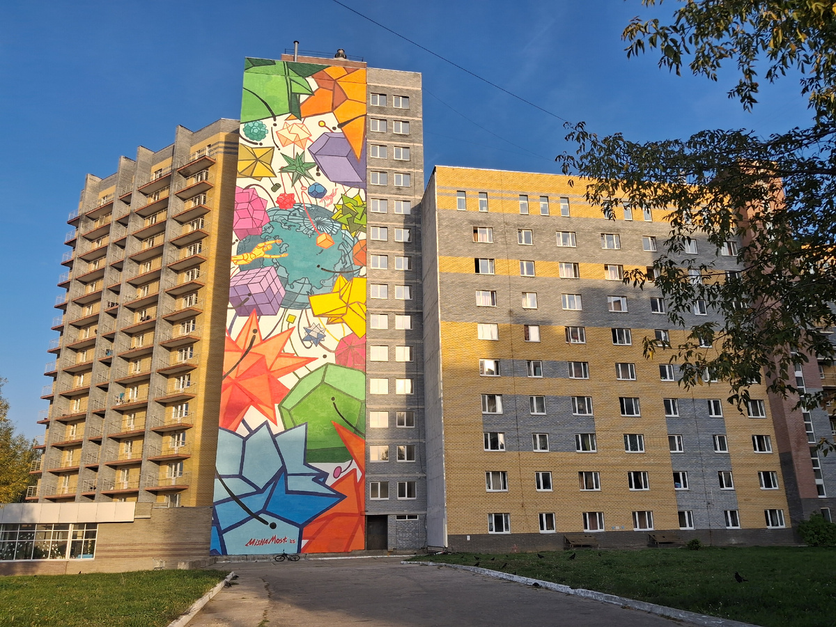 Я уже успела сообщить своим читателям, что ездила на другой конец города по делам блога. А что это за дела, не сказала намеренно. Не хотелось вносить некоторую сумятицу в мою тему великолепных нижегородских закатов. Но вот момент настал. Совсем недавно, где-то дней 10 назад, стену одной из многоэтажек Нижнего Новгорода (общежитие НГТУ им. Р. Е. Алексеева) в микрорайоне Верхние Печоры Нижегородского района украсил мурал. Проще говоря, картина, относящаяся к уличному искусству стрит-арт. Муралами называют большие уличные картины. Посмотрите. Даже далеко ходить не нужно. Выходишь на автобусной остановке, поворачиваешь за угол и сразу же видишь уникальное зрелище. Картина под открытым небом называется "Cosmos", автор - художник Миша Most. Она является одним из нескольких появившихся на улицах нашего города муралов в рамках выставки под открытым небом "Воздух". Проект "Воздух" задуман и реализован при поддержке платформы Дзен, он приурочен к проходящей с весны этого года в нашем гор