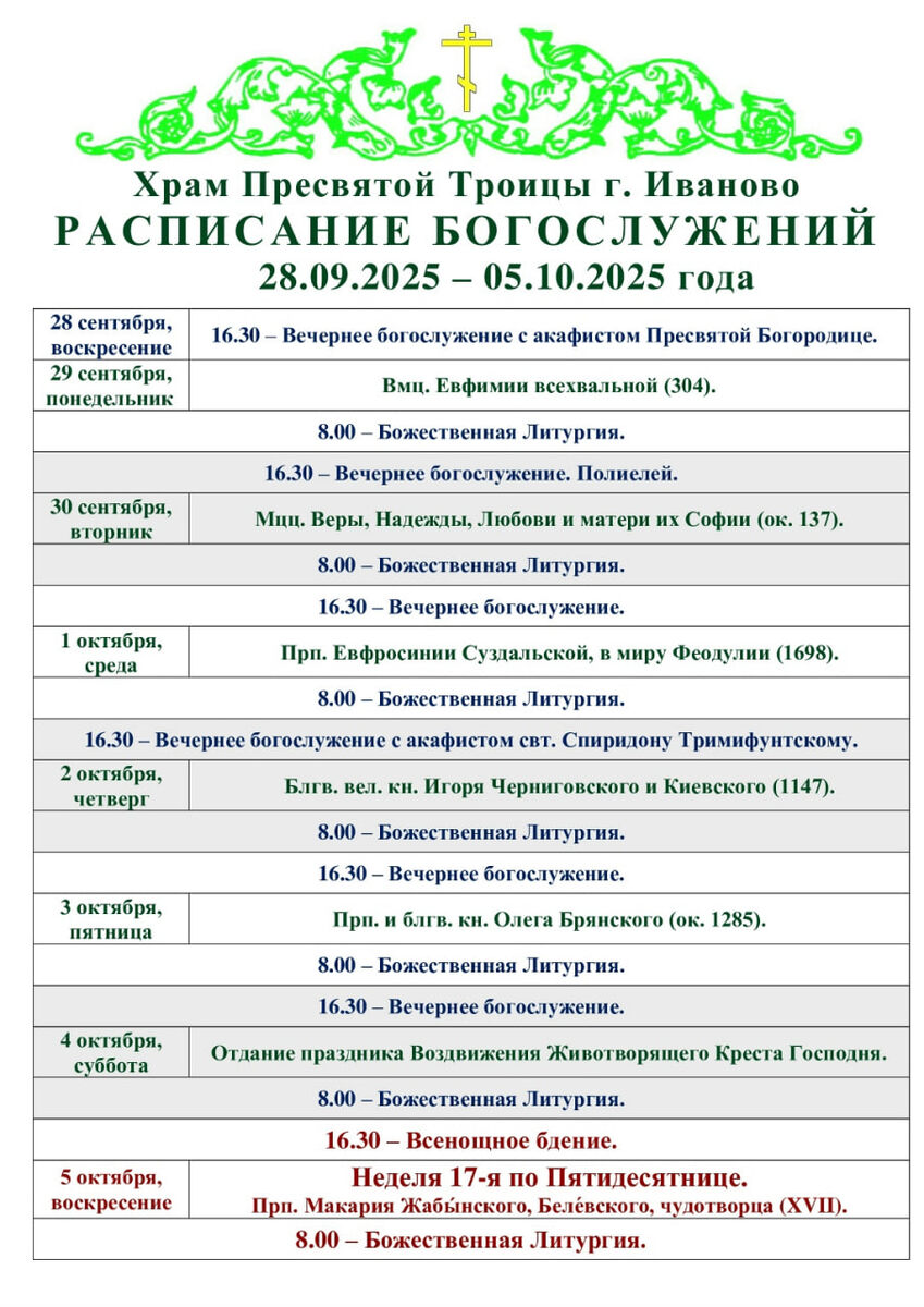 28.09-05.10. Расписание богослужений в Троицком храме г. Иваново