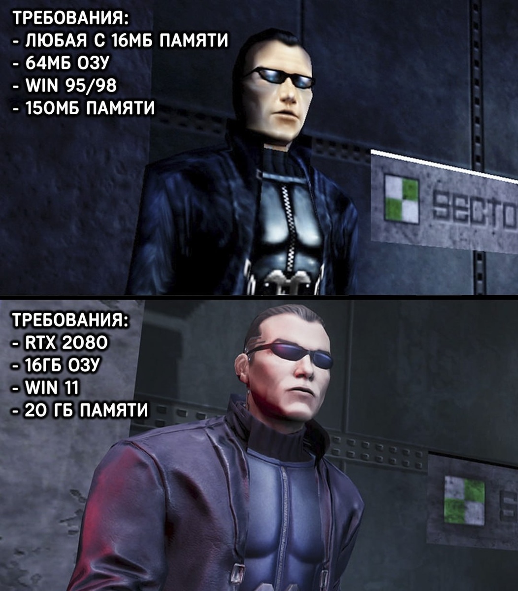 Мем дня: для работы Deus Ex Remastered требуется гораздо более мощный ПК в, чем Deus Ex: Mankind Devided. Оригинальная игра работает даже с 16 МБ видеопамяти, тогда как ремастер требует топовую видеокарту RTX 20-серии. Ремастеры, обстановка. CtrlAltDelights- подписаться