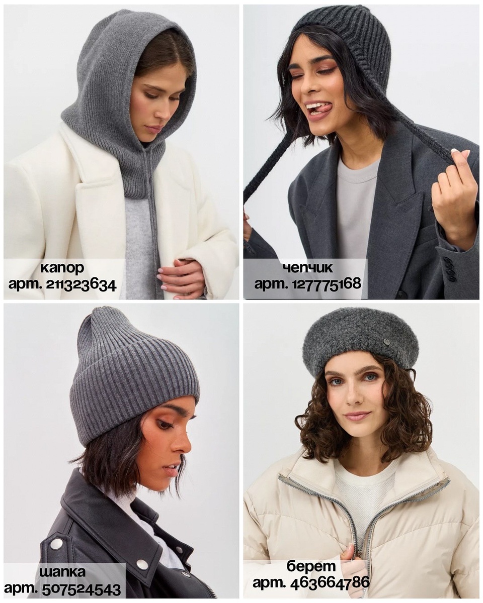 Зимой головной убор — это и практичность, и стиль. Он меняет настроение всего комплекта, подчёркивает черты лица и позволяет играть с пропорциями верхней одежды. Ниже — три цветовые капсулы: графитовая, алая и шоколадная. В каждой — по четыре модели, разобранные строго по порядку и с артикулами. Я описала посадку, характер, к чему носить и дала точный совет стилиста.