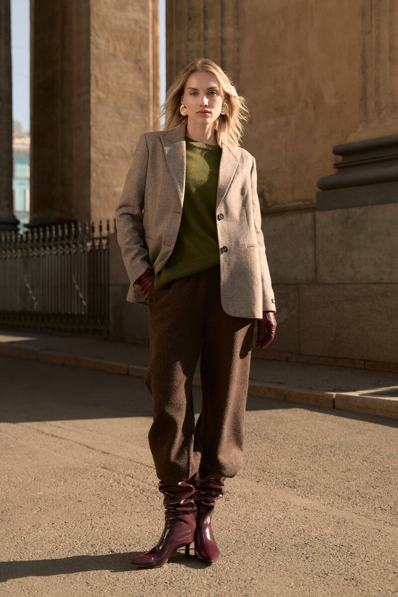 Выходные в городе — это всегда немного про свободу. Когда можно замедлиться, пройтись по любимым улицам, заглянуть в кафе или просто насладиться тёплым осенним светом. В таком настроении особенно нужны вещи, которые держат баланс: между комфортом и элегантностью, теплом и лёгкостью. – Однобортный жакет из смесовой шерсти – Тонкий свитер с ангорой – Брюки из смесового хлопка – Сумка кросс-боди и перчатки Нейтральная база и глубокие акценты создают образ, который будет с вами в любой сценарий выходного дня.