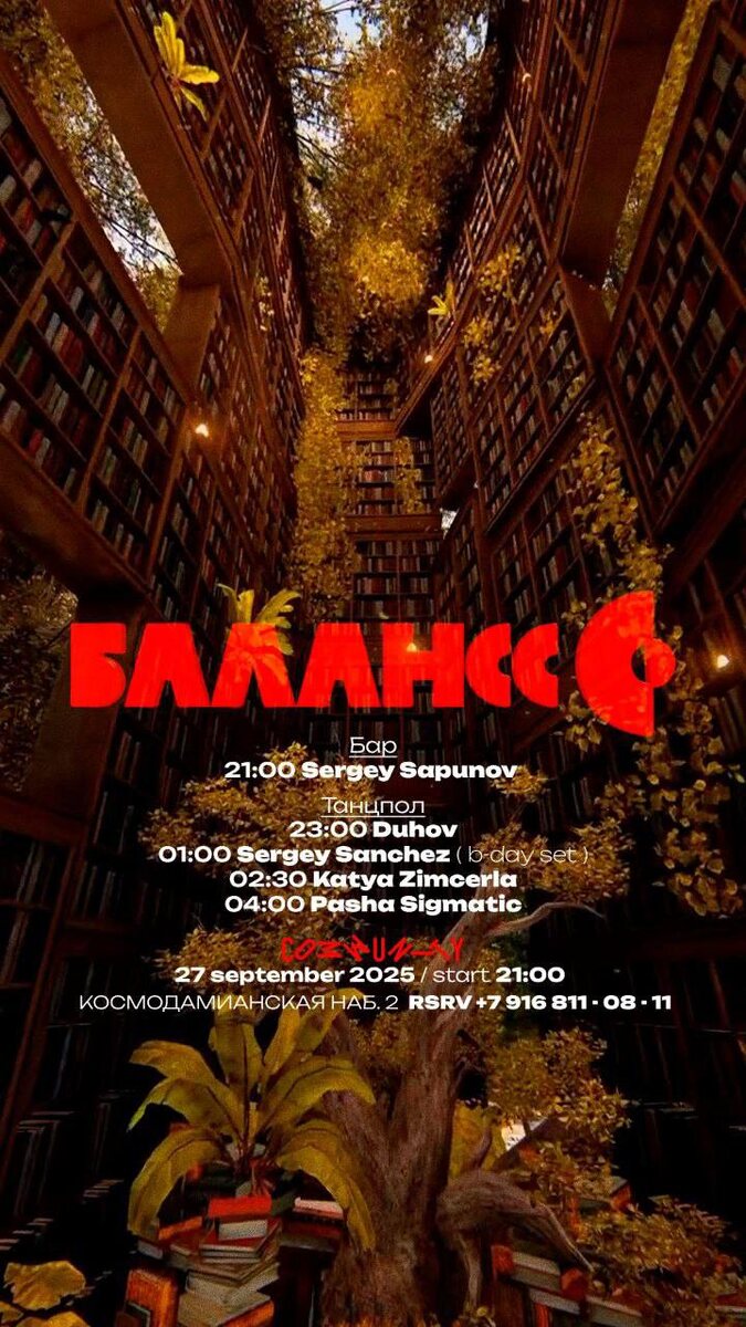27 СЕНТЯБРЯ 2025 / БАЛАНСС В COMMUNITY Вечеринка Балансс собирает друзей в пространстве культурного центра Community. В эту ночь отмечаем День рождения маэстро Сергея Санчеса, а винтажный звук от компании Dynacord раскроет всю палитру хаус музыки от резидентов и гостей проекта: 🎫 Билеты 📆 27 сентября, в 21:00 📍 Community Moscow, Космодамианская наб., 2