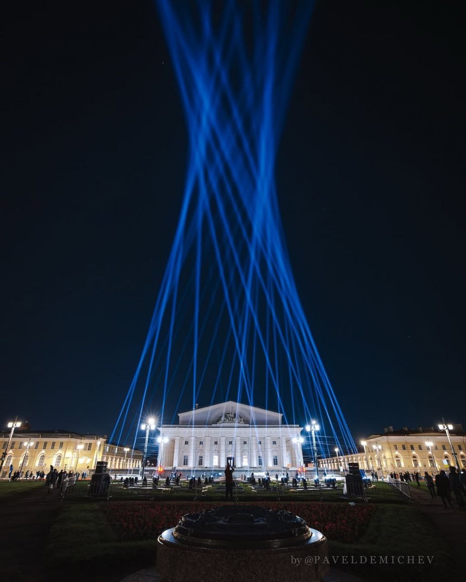 😎На Стрелке Васильевского острова в ночное небо поднялись 80 синих световых лучей