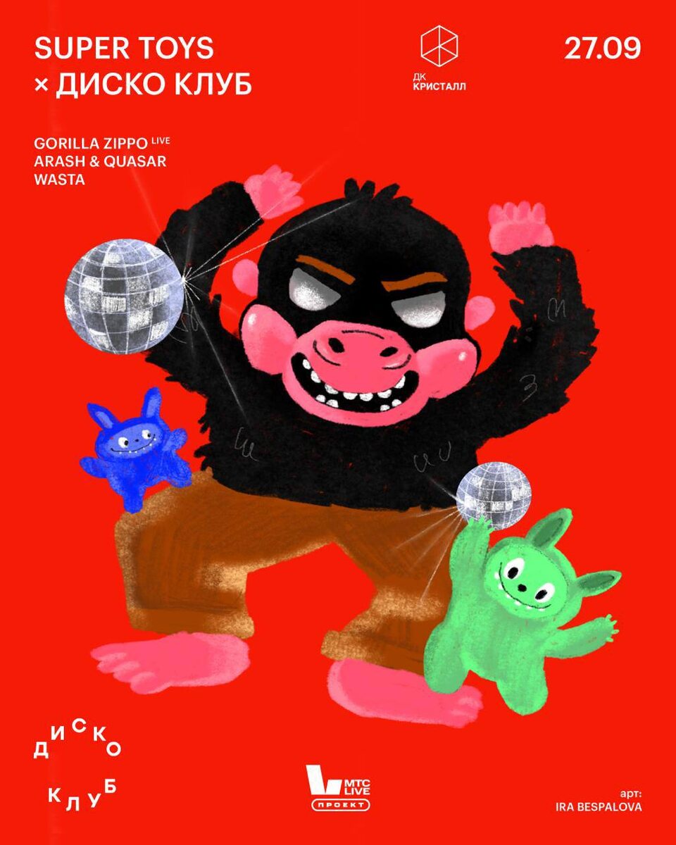 SUPER TOYS × ДИСКО КЛУБ 27 сентября В ДК «Кристалл» сегодня стартует масштабная выставка «SuperToys. Искусство внутри», на которую точно стоит сходить! В честь её открытия Дискоклуб с МТС LIVE решили сделать не менее масштабную тусу с эксклюзивным 3-часовым лайвом GORILLA ZIPPO и не только. Кстати, после выступит Васта! GORILLA ZIPPO (LIVE) ARASH QUASAR WASTA 🎫 Билеты 📆 27 сентября, в 22:00 📍 ДК Кристалл, Москва, Самокатная 4с11