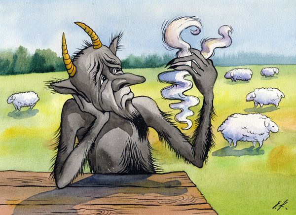 Идёт он так, идёт, вдруг навстречу ему – чёрт. Рожа хитрая, цыганская, зато костюмчик на нём отличный, стрижка наилучшая, чёрные усики, а во рту сигара. Рогов в густых волоса особо и не видать. Только вместо штиблет на ногах копыта лакированные.