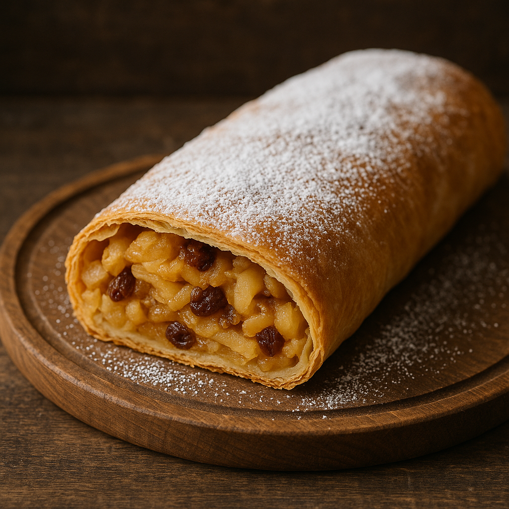 Есть блюда, которые невозможно спутать ни с чем другим. Яблочный штрудель — именно из этой категории. Он пришёл к нам из Австрии и Германии, но давно прижился в России: осенью, когда яблоки ещё ароматные и сочные, штрудель становится настоящим хитом. В каждой семье есть своя версия: кто-то делает его на слоёном тесте, кто-то готовит тончайшее вытяжное, как в Вене. Но суть одна — тёплый рулет с хрустящей корочкой и нежной яблочной начинкой, пахнущий корицей.